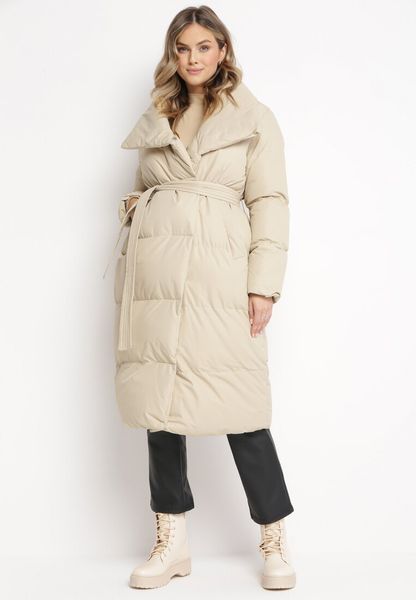 Beżowa Kurtka Płaszcz Zapinana na Napy Ukryte pod Plisą z Kieszeniami i Paskiem Ritallas
