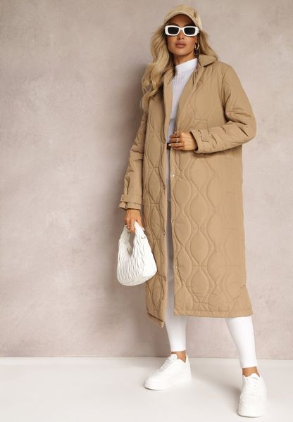 Ciemnobeżowy Długi Płaszcz Kurtka Ozdobiona Pikowaniem Hamid