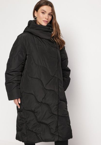 Czarna Długa Kurtka Płaszcz z Nieodpinanym Kapturem Ozdobiona Pikowaniem Nenzova
