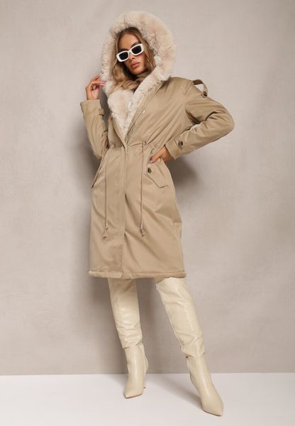 Beżowa Długa Kurtka Parka Nylonowa Płaszcz z Futrzanymi Wstawkami Rinale