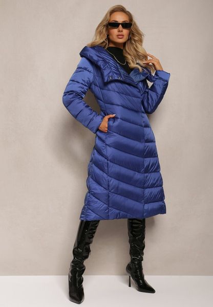Niebieska Długa Kurtka Płaszcz z Pikowaniem i Kapturem Tittonna