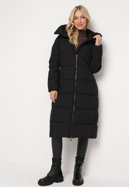 Czarna Zimowa Kurtka za Kolano Płaszcz z Szerokim Pikowaniem i Nieodpinanym Kapturem Hressa
