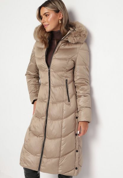 Beżowa Pikowana Kurtka Płaszcz za Kolano z Kapturem i Futerkiem Naelora