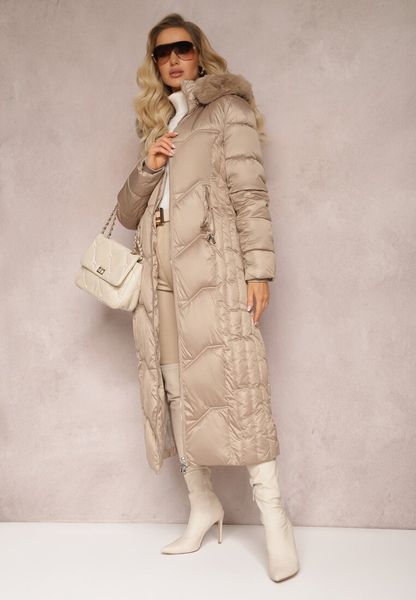 Beżowa Kurtka Płaszcz z Ozdobnym Pikowaniem z Kapturem z Futerkiem i Marszczeniami Larian