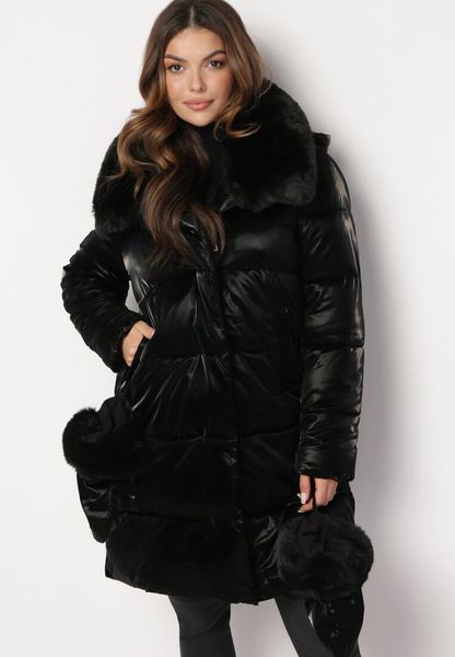 Czarna Pikowana Kurtka Płaszcz z Futerkiem i Rękawiczkami Avezze