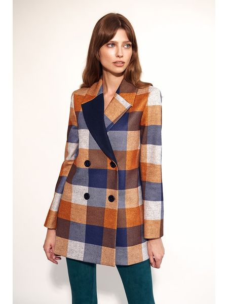 – kołnierzyk: z klapami- zapięcie: dwurzędowa listwa guzikowa- krój: prosty- wzór: kratka