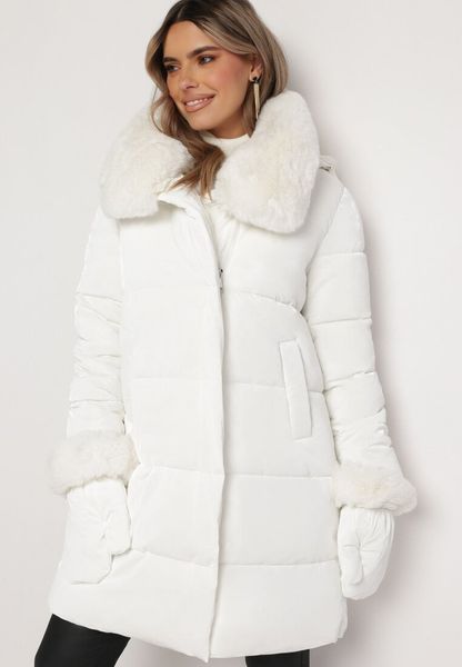 Biała Pikowana Kurtka Płaszcz z Futerkiem i Rękawiczkami Avezze