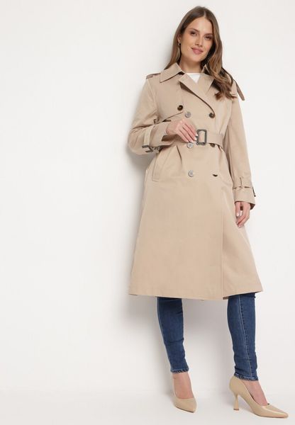 Beżowy Płaszcz Trencz Dwurzędowy z Plisami z Tyłu i Materiałowym Paskiem Hellie