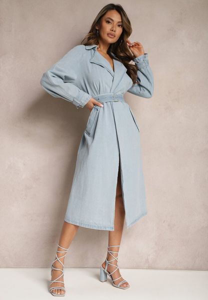 Niebieski Płaszcz z Jeansu z Przetarciami i Paskiem ze Sprzączką Umiorrea
