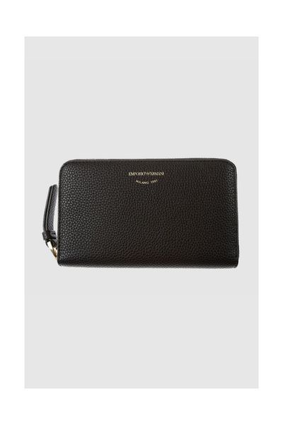 Portfel damski EMPORIO ARMANI średniej wielkości w kolorze czarnym. Z przodu logo firmy w kolorze złotym. Portfel zapinany na zamek. 6 miejsc na karty i 2 przedziały na banknoty. Kieszeń na monety zapinana na zamek.Zapakowany w pudełko firmowe. Wszystkie produkty z oferty outfit.pl są oryginalne i pochodzą bezpośrednio od producentów lub sprawdzonych dystrybutorów.