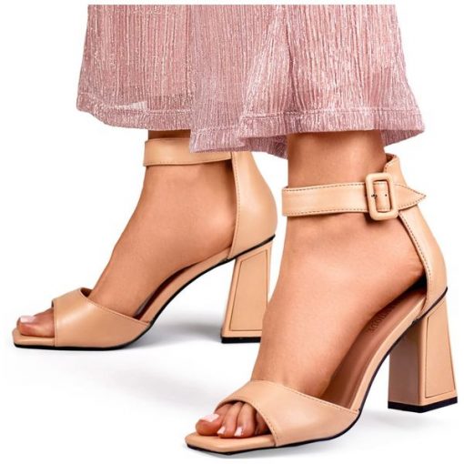 Beżowe sandały damskie z szerokim paskiem zapinanym na kostce beżowy