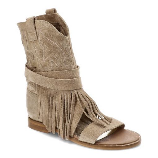 Beżowe Botki Carinii Stylowe Sandały Damskie Z Frędzlami