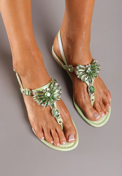Zielone Płaskie Sandały Japonki Ozdobione Opalizującymi Cyrkoniami Landrea