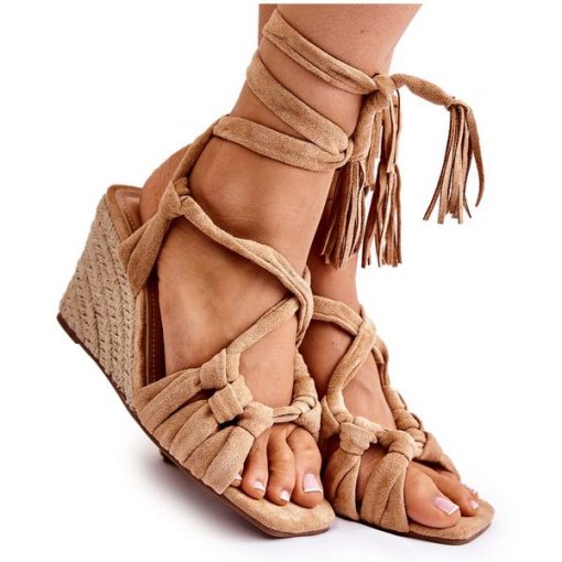 Zamszowe Wiązane Sandały Na Koturnie Beżowe Flavia beżowy