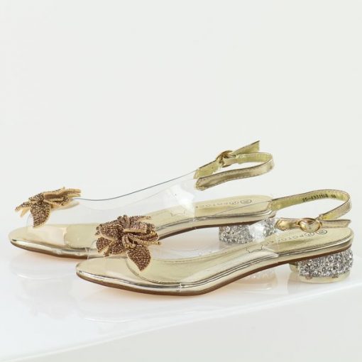 Złote silikonowe sandały damskie na obcasie z ozdobą, transparentne Po