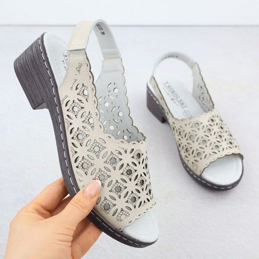Skórzane sandały damskie ażurowe na klocku beżowe T.Sokolski L25-25