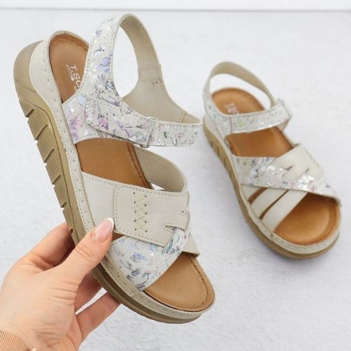 Skórzane sandały komfortowe na rzep w kwiaty beżowe T.Sokolski L25-173 beżowy