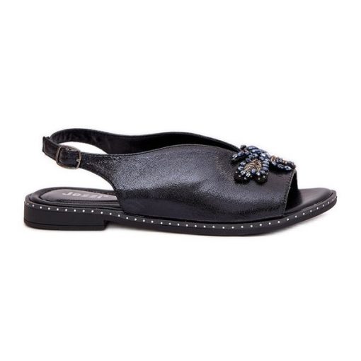 Jezzi Połyskujące Sandały Damskie Z Ozdobą Płaskie Czarne