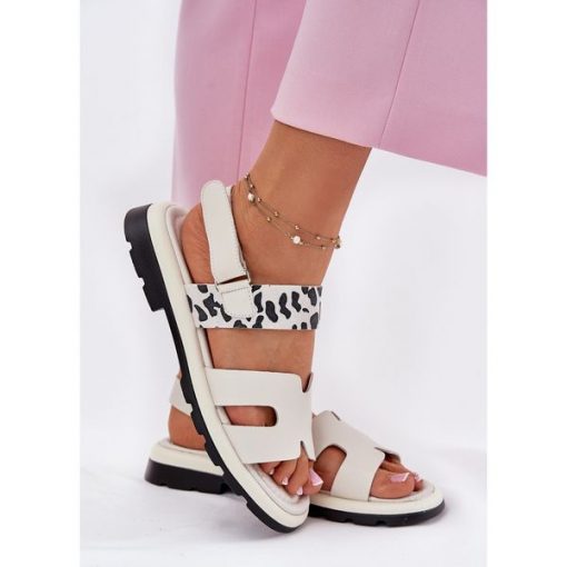 Skórzane Sandały Damskie Na Płaskim Obcasie Panterka Vinceza 66780 Beżowe beżowy