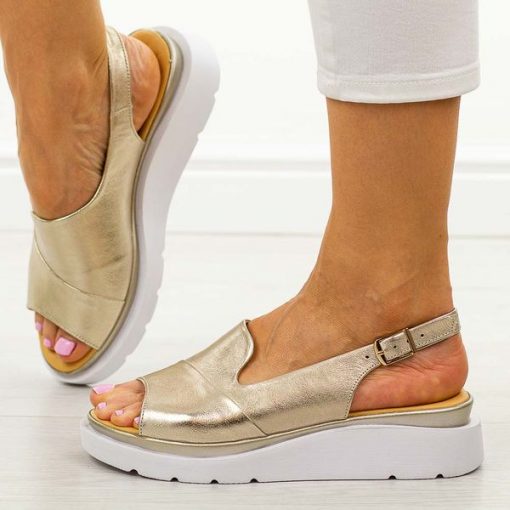 Złote skórzane Polskie sandały damskie na koturnie Deoni D009