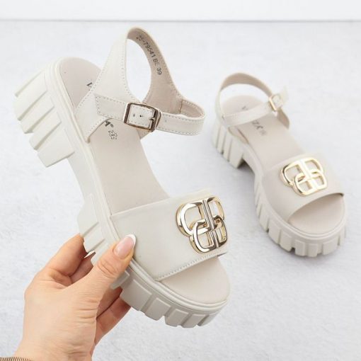 Skórzane sandały damskie na klocku beżowe Vinceza 79541