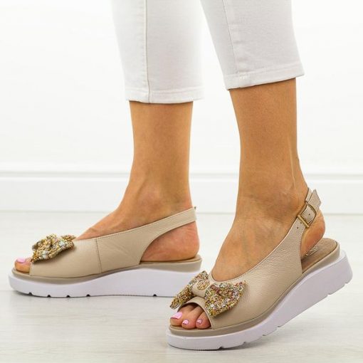 Beżowe skórzane Polskie sandały damskie na platformie Deoni D006