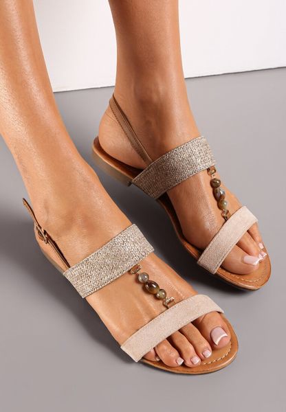 Beżowe Sandały na Płaskiej Podeszwie z Ozdobą z Koralików Nalla