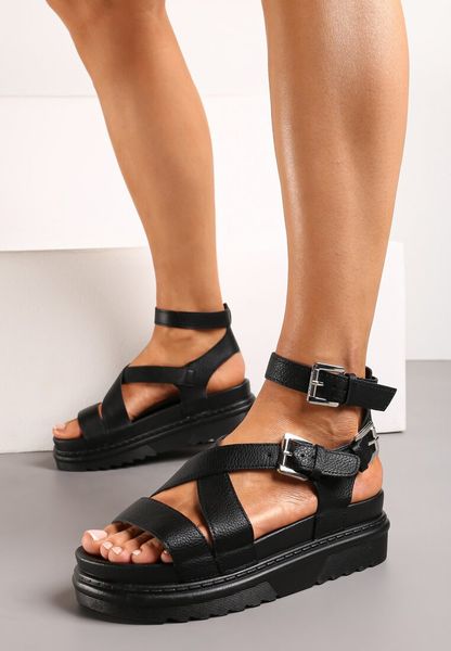 Czarne Sandały Zapinane wokół Kostki na Grubej Podeszwie Diunna