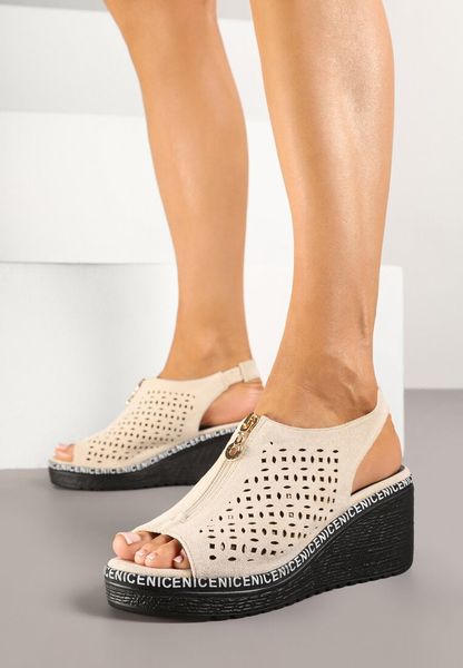 Beżowe Ażurowe Sandały na Koturnie z Suwakiem Adivine