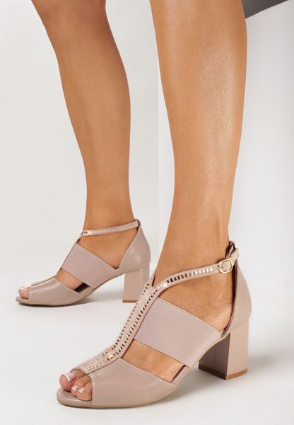 Beżowe Sandały na Słupku Ozdobione Kryształkami i Elastycznym Paskiem Nilucca