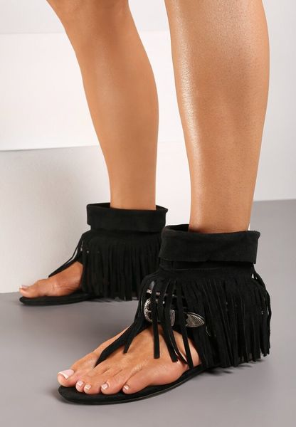 Czarne Sandały Japonki w Stylu Boho z Frędzlami i Klamerkami Effivetia