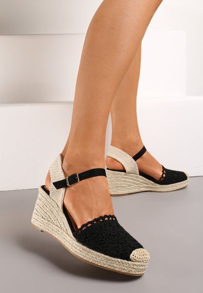 Czarne Ażurowe Sandały Espadryle na Koturnie Ozdobionym Plecionką Kija