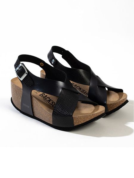 – materiał wierzchni ze skóry syntetycznej- rodzaj zapięcia: sprzączka- noski: otwarte- skórzana wkładka: ergonomicznie formowana- forma obcasa: koturny- podeszwa: antypoślizgowa- wykonano w Hiszpanii