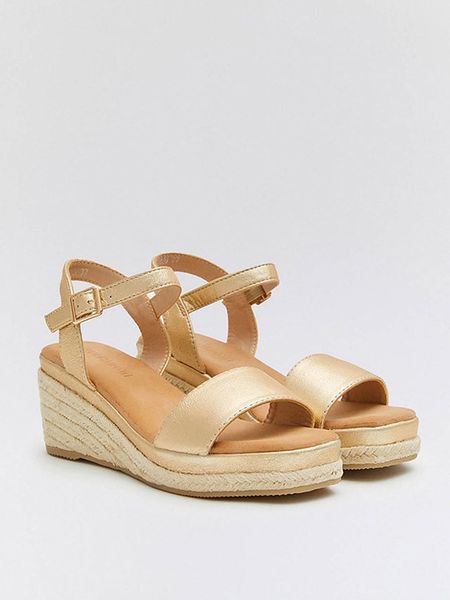 – zapięcie: sprzączka- noski: otwarte- powierzchnia: z metalicznym połyskiem- obcas: koturny z platformą z przodu- podeszwa: antypoślizgowa
