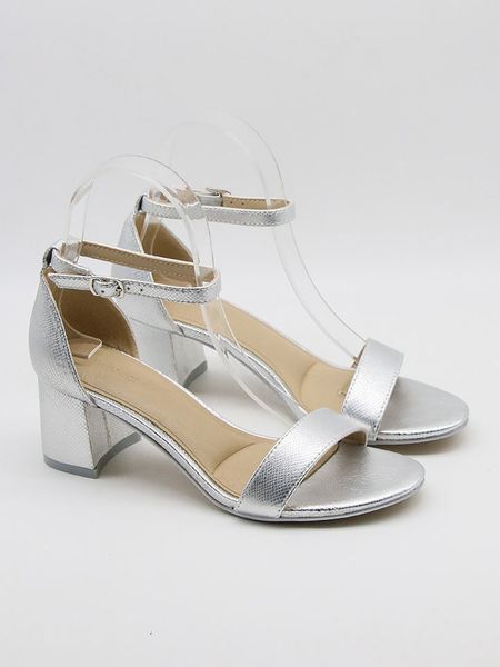 – zapięcie: sprzączka- noski: otwarte- powierzchnia: z metalicznym połyskiem- forma obcasa: blokowy- podeszwa: antypoślizgowa