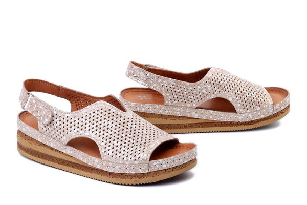 Sandały damskie. Naturalna skóra. Ażurowa cholewka. Miękka, skórzana wkładka. Zapięcie na rzep. Wygodny koturn. Tęgość F 1/2.