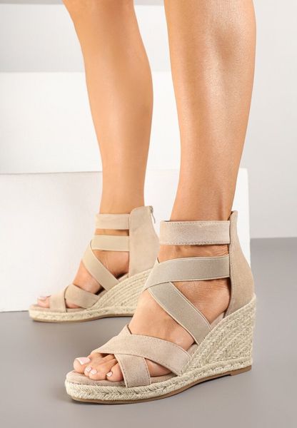 Ciemnobeżowe Sandały Vices na Plecionym Koturnie w Stylu Boho Telomaris