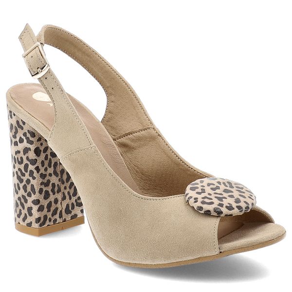 Sandały damskie Armodo, skórzane na wysokim obcasie z ozdobą w panterkę na sprzączkę, beżowo-panterkowe, 1819