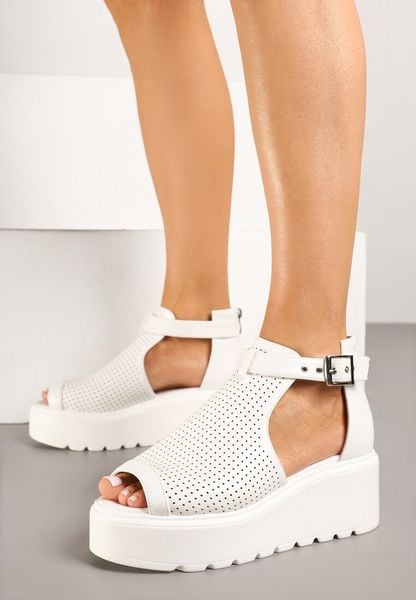Białe Sandały na Koturnie ze Skórzaną Wkładką i Wycięciami Sopiaella