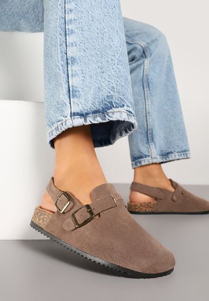 Ciemnobeżowe Sandały Chodaki z Ozdobną Klamerką i Paskiem Senelra
