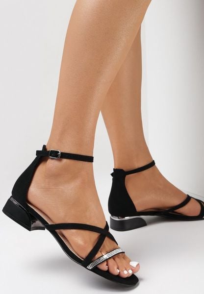 Sandały Orope na niskim, kwadratowym obcasie. Obcas zdobiony lustrzaną wstawką. Otwarty, zaokrąglony nosek, pięta zakryta. Cholewkę tworzą cienkie paski, przy palcach pasek zdobiony małymi cyrkoniami. Zapinane na pasek z małą klamerką na wysokości kostki. Wykonane z ekozamszu, wkładka z ekoskóry. Noś je w towarzystwie jeansowych szortów, plisowanych spódnic lub szerokich spodni.