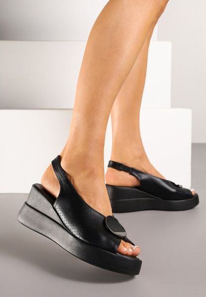 Czarne Ażurowe Sandały na Koturnie Ozdobione Aplikacją Atavia