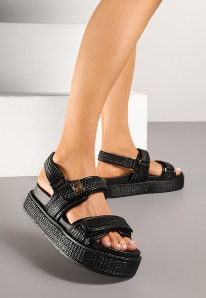 Czarne Plecione Sandały na Platformie Ozdobione Metaliczną Aplikacją Liaelle