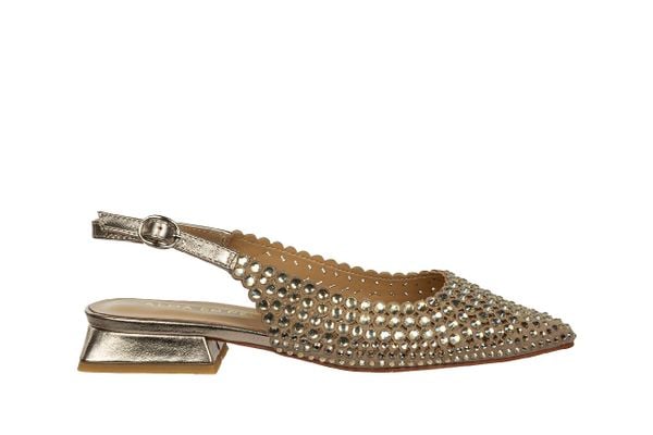 Sandały hiszpańskiej marki Alma En Pena w kolorze złotym w odcieniu platynowym.Eleganckie sandały z noskiem w szpic i odkrytą piętą. Cholewka ozdobiona migoczącymi kryształkami, co nadaje im wyjątkowego blasku i elegancji.Cholewka wykonana jest w 95% z materiału tekstylnego i w 5% ze skóry naturalnej. Wnętrze ze skóry ekologicznej. Zapięcie regulowane na sprzączkę.Podeszwa z antypoślizgowej gumy.Alma […]