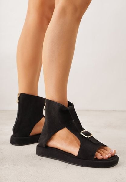 Czarne Sandały Typu Botki Ozdobione Metaliczną Klamrą z Przodu Adrasaia