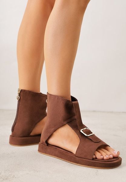 Brązowe Sandały Typu Botki Ozdobione Metaliczną Klamrą z Przodu Adrasaia