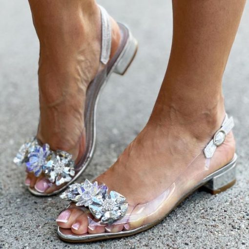 Srebrne silikonowe sandały damskie na obcasie, transparentne z kryszta