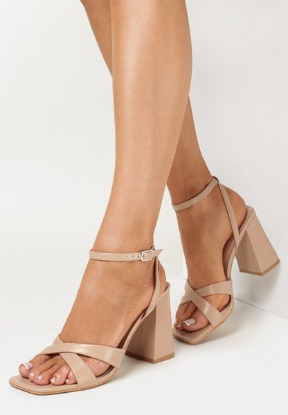Ciemnobeżowe Sandały na Słupku z Kwadratowym Noskiem Ashai