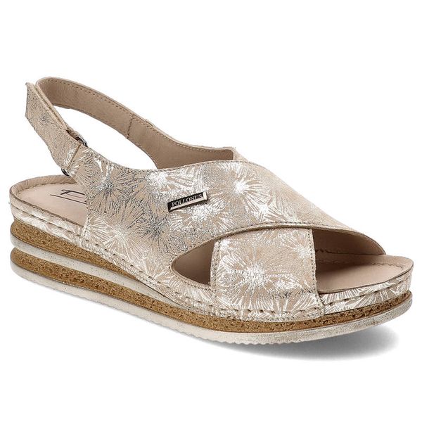 Beżowe sandały POLLONUS – 5-1514-002 Margerita Koza to wybitne obuwie, wykończone metaliczną nicią. Znakomitą cholewkę ukształtowano z zamszu. Komfortowe wnętrze umożliwia długotrwałe noszenie fasonu bez obawy o ból. Wnętrze ze skóry naturalnej dobrze amortyzuje stawy. Damskie sandały POLLONUS – 5-1514-002 Margerita Koza