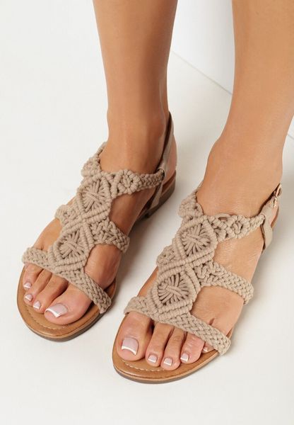 Ciemnobeżowe Płaskie Sandały Boho z Szydełkową Cholewką Wolirles